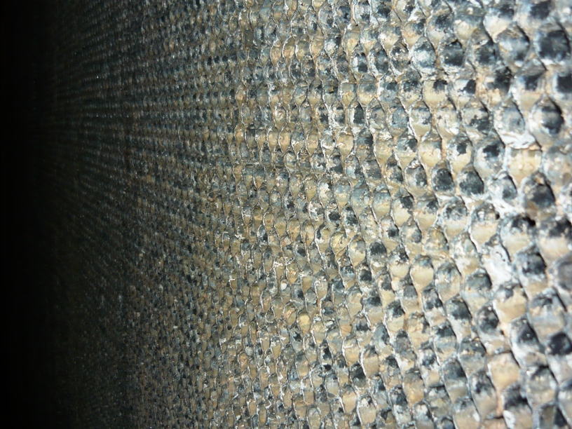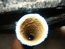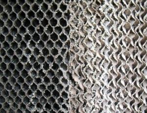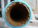 ภาพภาคตัดของท่อน้ำที่ใช้ในระบบกระจายน้ำที่มีแต่หินปูนและสิ่งสกปรกเกาะอยู่เต็มไปหมด
